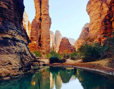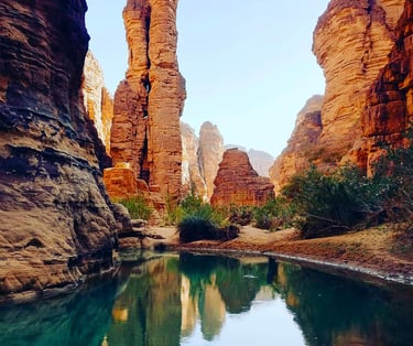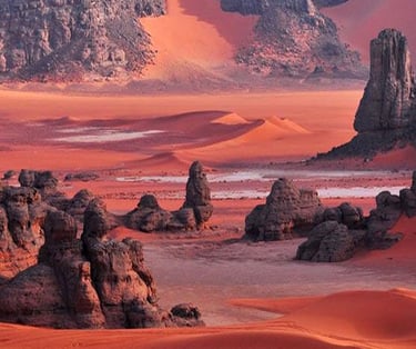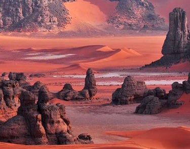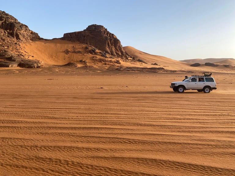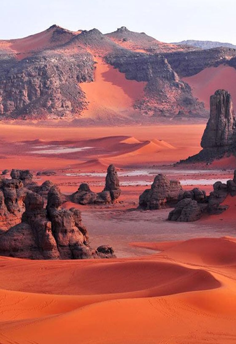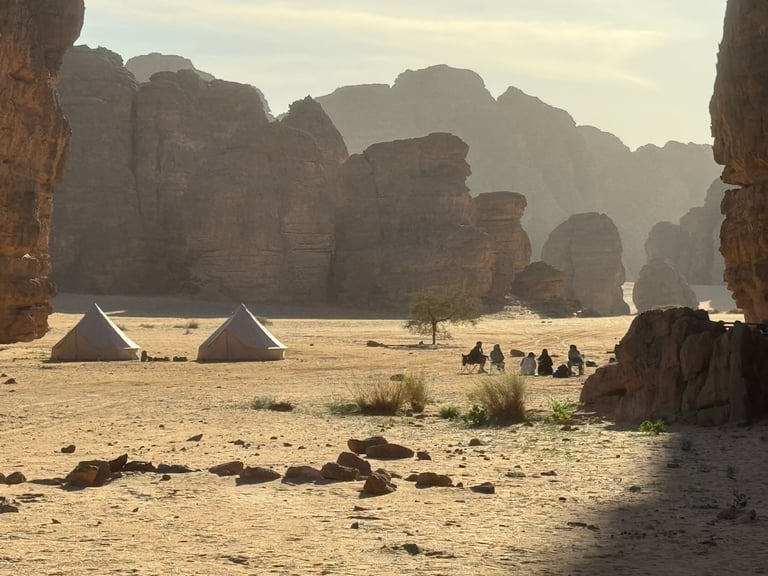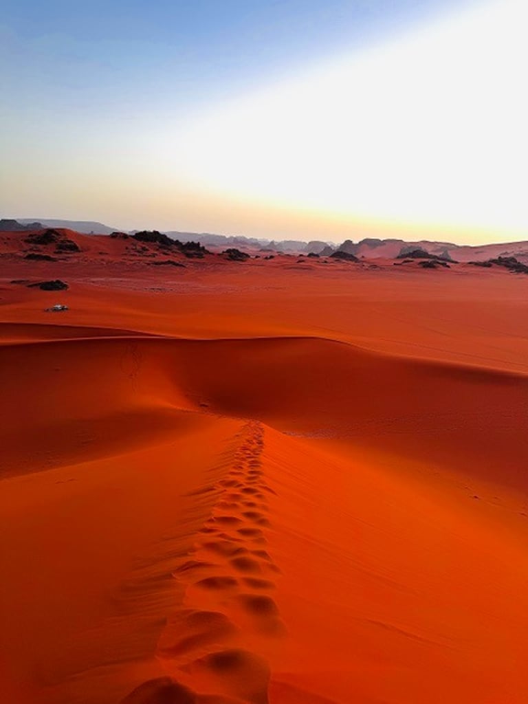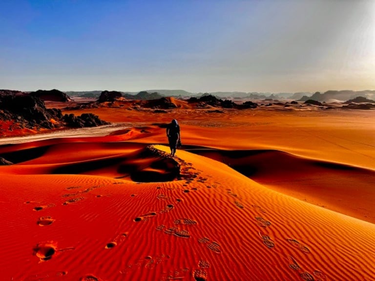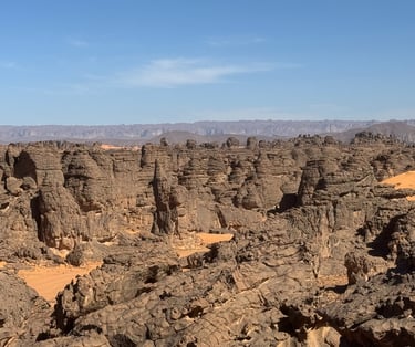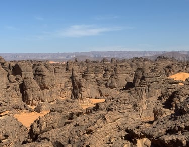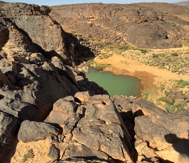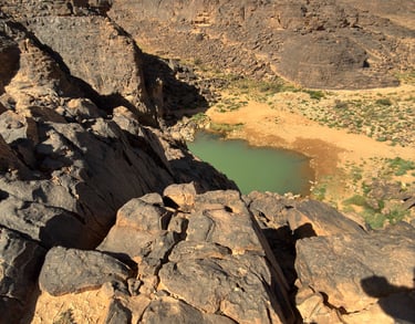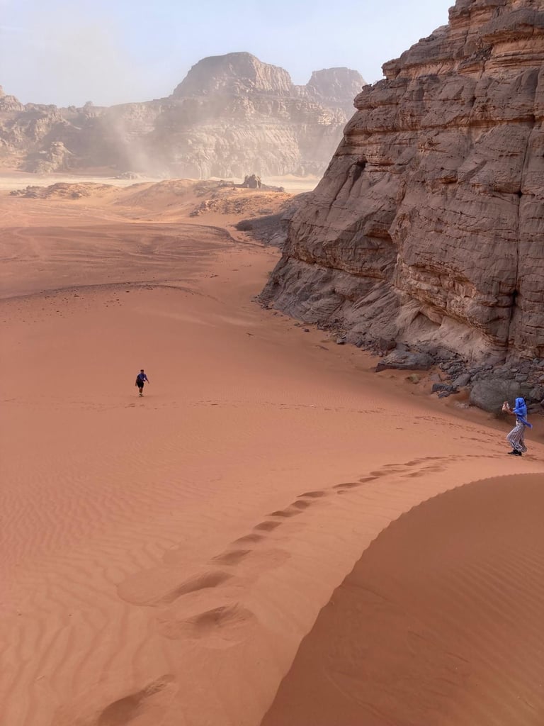 À 200 kilomètres au nord-ouest de Djanet, nous traversons des paysages sahariens variés et contrastés : canyons, dunes, oueds, plateaux, gueltas.
